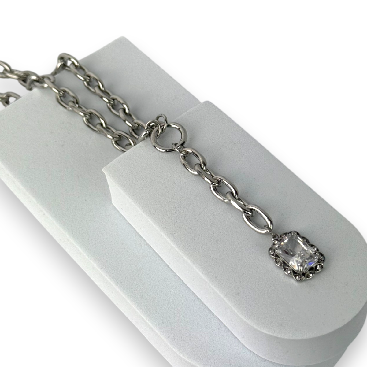 Statement κολιέ με ασημί χοντρή αλυσίδα και μενταγιόν με διάφανη πέτρα.