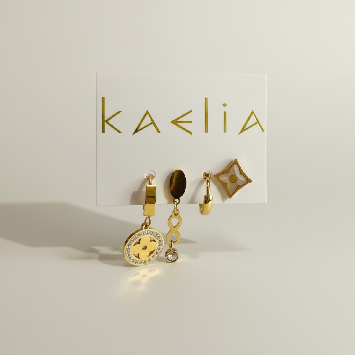 Μοντέρνο σετ τεσσάρων χρυσών σκουλαρικιών σε ασύμμετρο σχέδιο. Κάθε κομμάτι έχει διαφορετικό σχήμα και λεπτομέρεια — από σύμβολα μέχρι μικρές πέτρες — για μια μοναδική, statement εμφάνιση. Φοριούνται συνδυαστικά ή μεμονωμένα, προσφέροντας ευελιξία και στυλ. Δεν μαυρίζουν και διατηρούν τη λάμψη τους με τον χρόνο.
